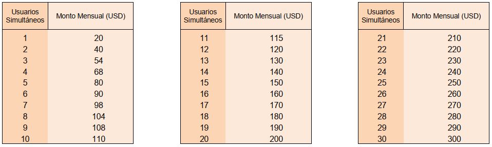 Ejemplo: si el referido adquiere 10 licencias (columna de usuarios simultaneos en la imagen), usted recibe 110$, pero, si usted cierra la venta, usted recibe 220$ (el doble). Aquí puede apreciar cuanto podría ganar, según el número de licencias que adquiera el referido. (Precios válidos hasta el 31-12-2025).